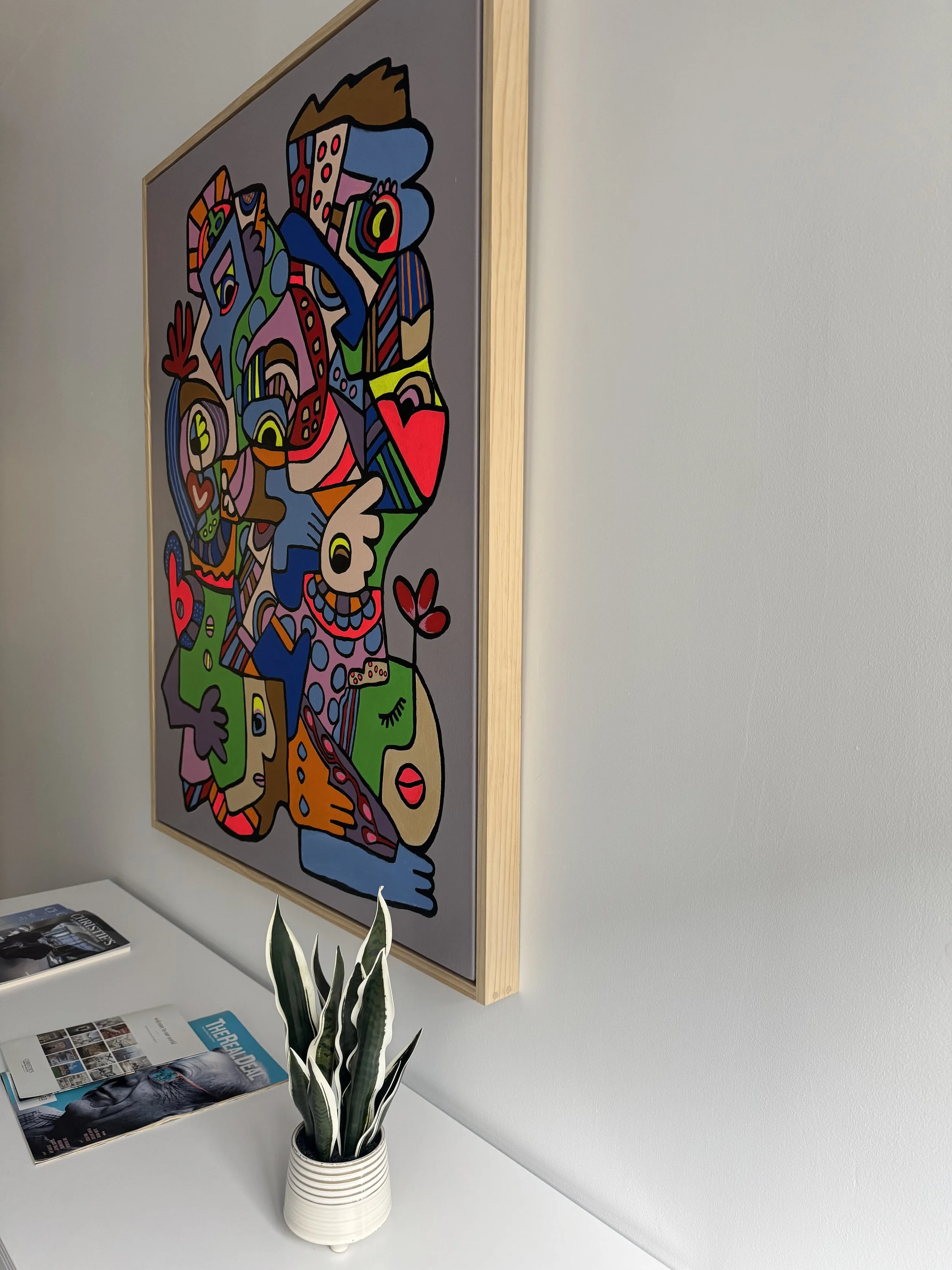 This collection marks the first time I allowed every fragment of my voice to exist on the canvas without restraint. Conceived as a pair, these large-scale originals speak in dialogue one calling, the other answering about what it means to bring the fractured self into harmony.Together, they hold the quiet force of becoming whole not by erasing what was broken, but by honoring every imperfect angle.